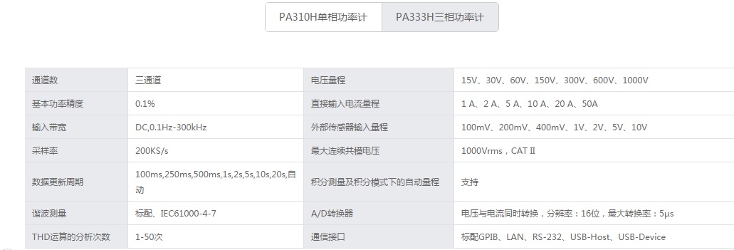 PA310H、PA333H功率計(jì)采用了雙分流器技術(shù),它無(wú)需使用外部傳感器便可以直接測(cè)量高達(dá)1000V的電壓、50A的電流,可輕松滿足高達(dá)50KW的大功率測(cè)試要求。