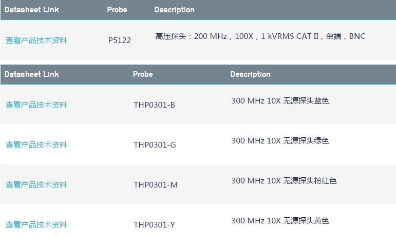 電源轉(zhuǎn)換電子器件測量通常要求擁有更高電壓等級的探頭。泰克提供了一種無源探頭,帶有專為進行浮動測量設(shè)計的絕緣系統(tǒng)。標(biāo)配 THP0301-X 可以測量高達 849 Vp-p (300 VRMS) 的電源。選配 P5122 探頭在 THS3000 系列結(jié)合使用時,適合在 II 類環(huán)境中測量 1000 VRMS 器件,相對于接地的最大浮動電壓可以高達 600 VRMS。