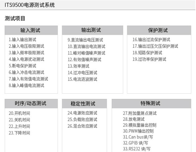 ITS9500 電源自動(dòng)測試系統(tǒng)改采用模塊設(shè)計(jì),組建了一個(gè)方便快捷、功能齊全的的電源測試平臺(tái)。更加利于日后的檢修和維護(hù),減低對生產(chǎn)線的影響