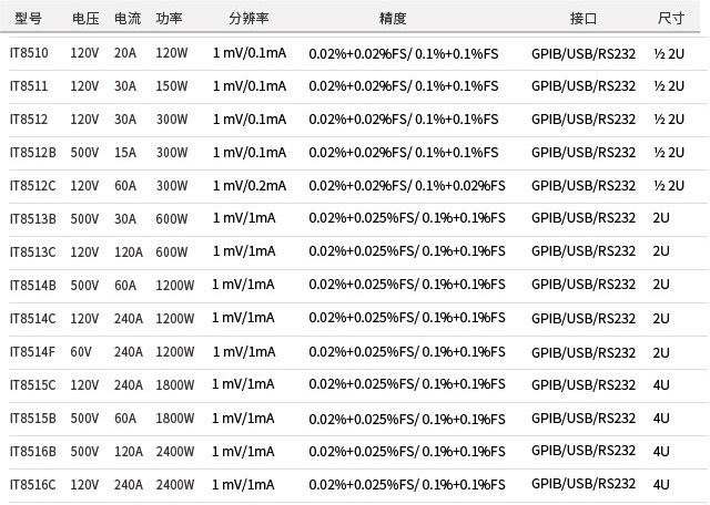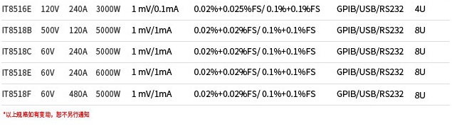 IT8500系列在具有極佳性價(jià)比的同時(shí)具備多種操作模式和測試功能,滿足客戶多元化的測試需求:可編程List輸出模式,定電壓、定功率、定電流、定電阻模式,遠(yuǎn)端測量、短路測試、電池測試、動(dòng)態(tài)測試功能。該系列具備良好的低電壓帶載特性,提供高效率、高精度的測試解決方案,可選配USB/RS232/GPIB通訊接口。