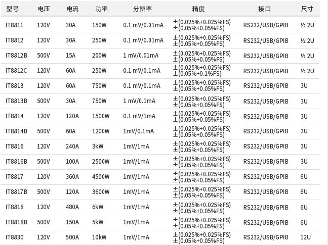 IT8800系列直流電子負(fù)載擁有寬廣的功率范圍150W-10KW,電壓電流測量速度均達(dá)到50KHz,測試分辨率可達(dá)0.1mV/0.01mA,測試電流上升速度0.001A/us~2.5A/us可調(diào),且內(nèi)置RS232/GBIP/USB通訊接口,參數(shù)指標(biāo)非常優(yōu)異。產(chǎn)品穩(wěn)定性高,應(yīng)用行業(yè)寬泛,能滿足各種測試需求,目前已經(jīng)應(yīng)用于多種要求苛刻的測試場所,例如LED照明,航空航天,汽車電子等多種領(lǐng)域;