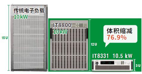 普通的能耗性電子負(fù)載不僅耗能耗電,本身的體積和重量也非常大。10KW的能耗型負(fù)載體積至少要12U,不但搬運(yùn)困難,成本較高。IT8300系列能量回饋式直流電子負(fù)載采用高功率密度設(shè)計(jì),3U體積內(nèi)可提供高達(dá)10.5KW的功率吸收。同樣的輸出功率,體積減少了76.9%。