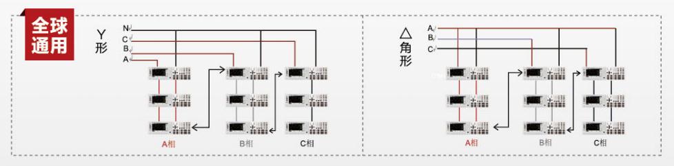 IT8600提供多臺(tái)并聯(lián)、三相與并聯(lián)三相的功能,可以實(shí)現(xiàn)對(duì)于三相交流電源或者更大功率電源的測(cè)試應(yīng)用。在三相并聯(lián)應(yīng)用中,用戶可以根據(jù)實(shí)際需求實(shí)現(xiàn)Y型和Δ型的連接方式,進(jìn)行自由靈活的搭配。IT8600還可以實(shí)現(xiàn)交流380V的輸入,全球通用,滿足多元的測(cè)試需求。(*僅限IT8615、IT8615L 具備此功能)