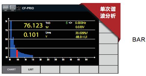 IT8600提供了功能強(qiáng)大的數(shù)據(jù)量測(cè)功能,除了可以測(cè)量常規(guī)的Vrms、Vpk、Vdc、Irms、Ipk、Idc、W、VA、VAR、CF、PF、Freq等參數(shù)外,更提供獨(dú)特的電壓諧波分析功能,以驗(yàn)證待測(cè)物(不間斷電源UPS,發(fā)電機(jī)等)。對(duì)于電網(wǎng)的諧波干擾,具有高達(dá)50次電壓諧波的分析功能,并且可以以不同形式顯示各次諧波所占百分比的分析結(jié)果。