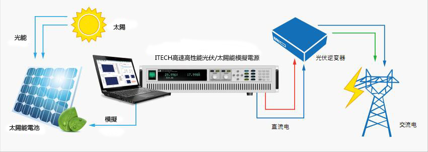 由於太陽電池只能生成直流電,且大小與陽光強度有關(guān),難以直接利用,因此需要光伏逆變器將其轉(zhuǎn)換成交流電,方便傳輸與利用。光伏逆變器的測試需要用光伏模擬器去直接模擬各種真實條件下的太陽能電池陣列,艾德克斯為此提供高速高性能光伏/太陽能模擬電源,內(nèi)建EN50530、Sandia、NB/T32004、CGC/GF004、CGC/GF035 的SAS模型,能夠類比多種太陽能電池的輸出特性,模擬不同溫度及照度下的I-V曲線,模擬太陽面板遮罩下 I-V 曲線, 類比各地區(qū)實際天候(天/月/年)I-V曲線,即時測試及顯示光伏逆變器的最大功率追蹤狀況,可以為微電網(wǎng)、分散式光伏等電源系統(tǒng)的系統(tǒng)模擬及核心設(shè)備檢測提供支援。同時,艾德克斯測試解決方案也提供模擬各種正常及異常的交流電輸入情況,並能量測待測物重要的電性能參數(shù),滿足光伏並網(wǎng)逆變器電網(wǎng)頻率回應(yīng)測試、反孤島效應(yīng)測試以及低電壓穿越測試的要求。