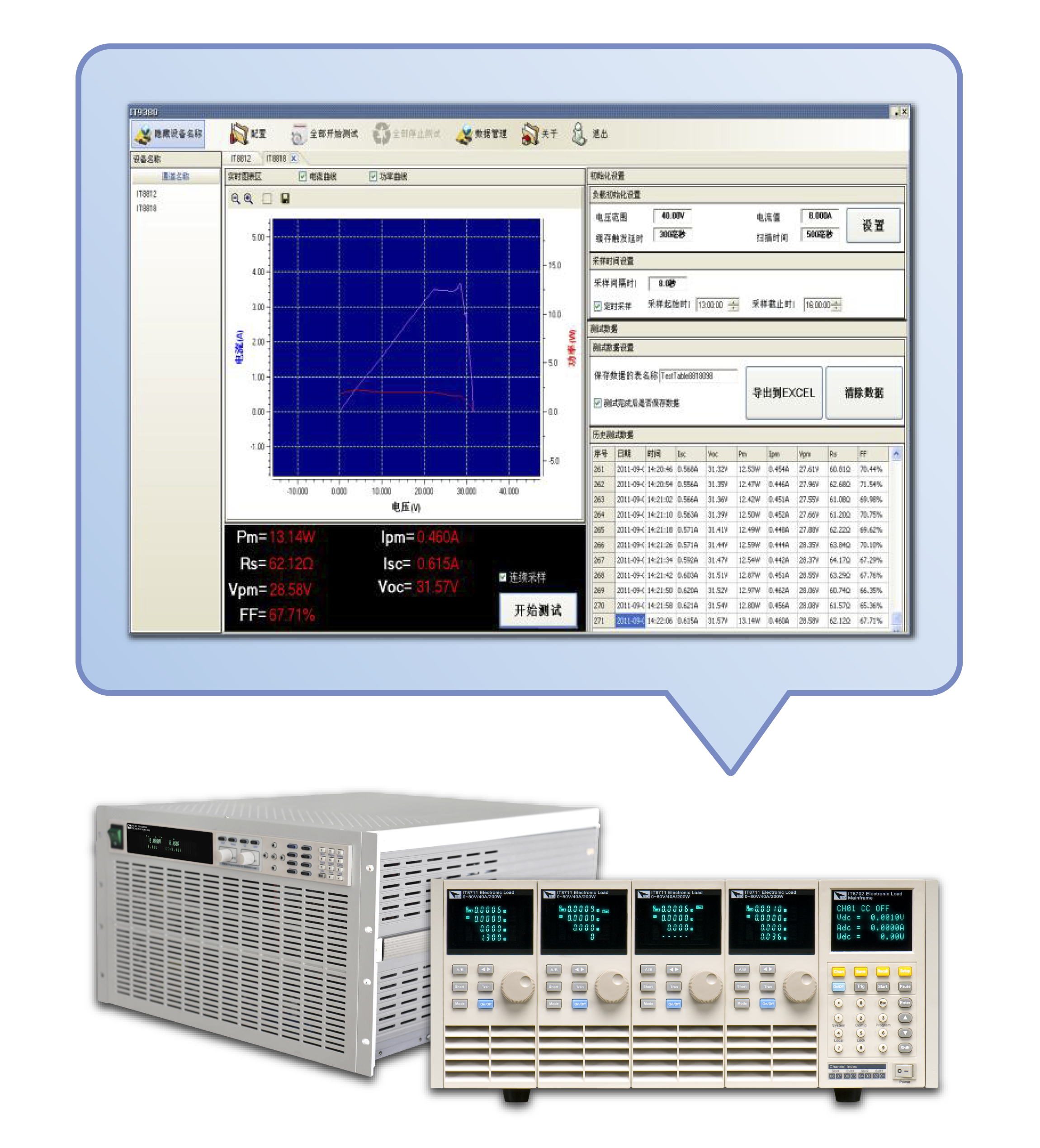 艾德克斯的測試解決方案可以自動描繪I-V曲線,測量並記錄峰值功率Pmax、峰值功率點的電壓Vpmax、峰值功率點的額定電流Ipmax、峰值功率點的電阻Rpmax、開路電壓Vopen、短路電流Ishort和填充因數(shù)FF等參數(shù)。