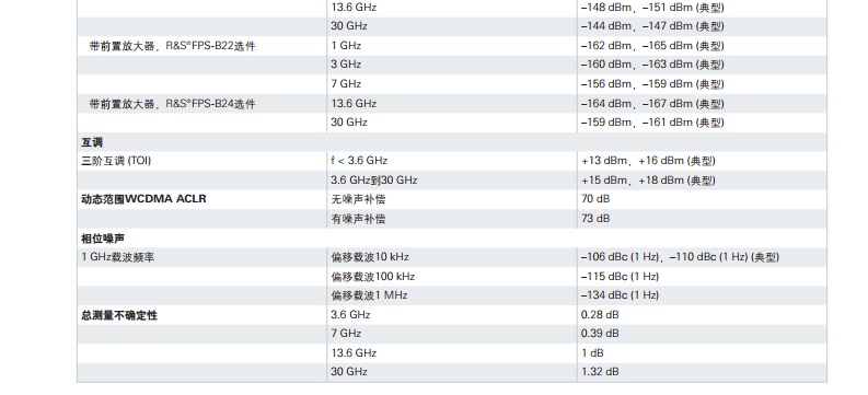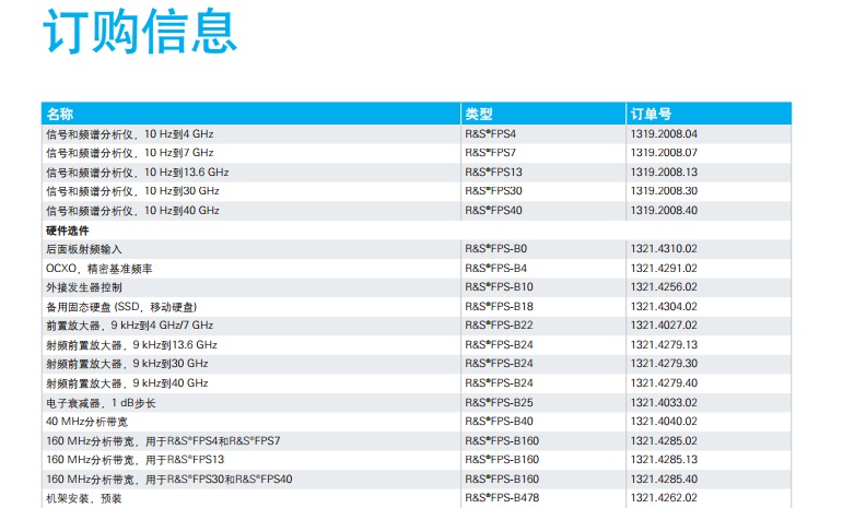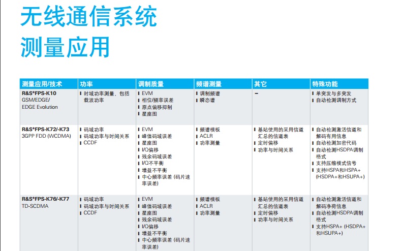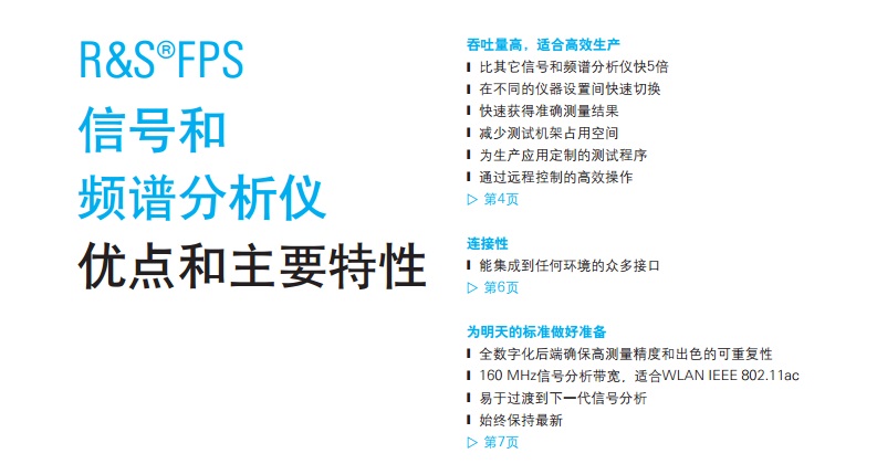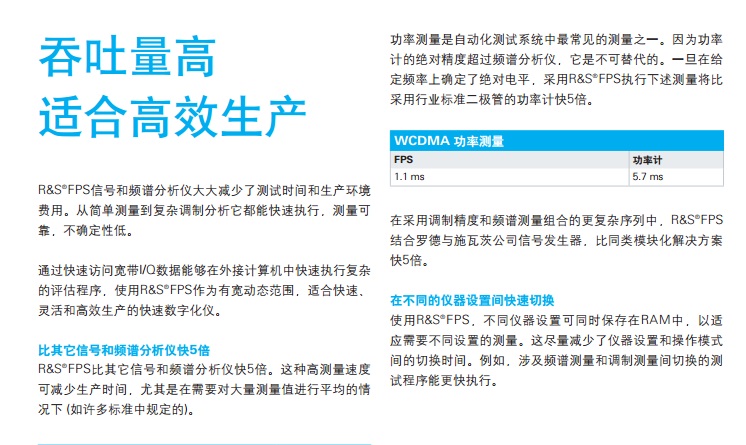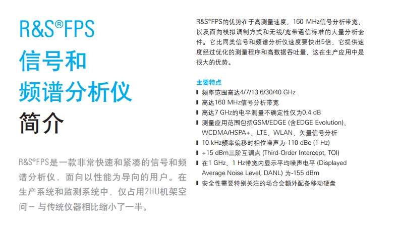 ?FPS 信號和 頻譜分析儀 簡介 ?FPS是一款非??焖俸途o湊的信號和頻 譜分析儀,面向以性能為導向的用戶。在 生產(chǎn)系統(tǒng)和監(jiān)測系統(tǒng)中,僅占用2HU機架空 間- 與傳統(tǒng)儀器相比縮小了一半。 ?FPS的優(yōu)勢在于高測量速度,160 MHz信號分析帶寬, 以及面向模擬調制方式和無線/寬帶通信標準的大量分析套 件。它比同類信號和頻譜分析儀速度要快出5倍,它提供速 度經(jīng)過優(yōu)化的測量程序和高數(shù)據(jù)吞吐量,這在生產(chǎn)應用中是 很大的優(yōu)勢。 主要特點 J 頻率范圍高達4/7/13.6/30/40 GHz J 高達160 MHz信號分析帶寬 J 高達7 GHz的電平測量不確定性僅為0.4 dB J 測量應用范圍包括GSM/EDGE (含EDGE Evolution)、 WCDMA/HSPA+、LTE、WLAN、矢量信號分析 J 10 kHz頻率偏移時相位噪聲為-110 dBc (1 Hz) J +15 dBm三階互調點 (Third-Order Intercept, TOI) J 在1 GHz、1 Hz帶寬內顯示平均噪聲電平 (Displayed Average Noise Level, DANL) 為-155 dBm J 安全性需要特別關注的場合會額外配備移動硬盤。