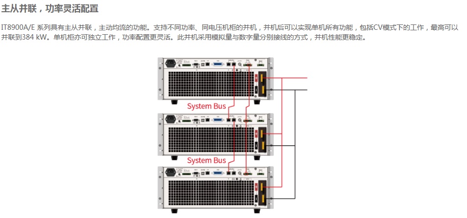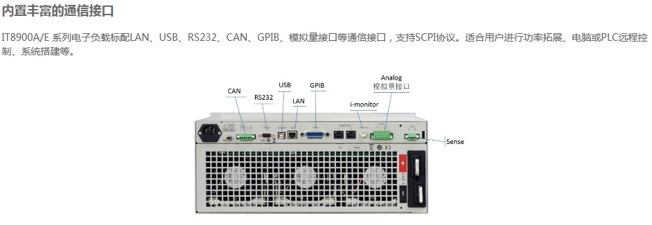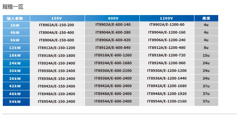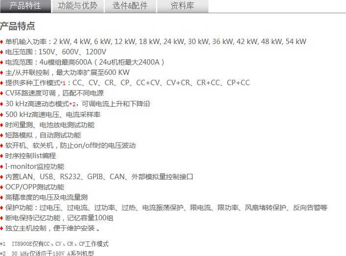IT8900 A / E系列高功率密度大功率直流電子負載,具有150V、600V、1,200V三種電壓范圍,單機功率從2 kW到 54 kW。較寬的電壓電流范圍,單機柜最大電流可達2400A。通過主從并聯(lián),最大功率可擴展到600 kW。高功率密度,6 kW僅4u高度。多達8種/4種工作模式,具有更快的環(huán)路響應(yīng)和電流上升、下降速度,另有動態(tài)模式、OCP、OPP測試、自動測試及電池測試功能。內(nèi)置CAN、LAN、GPIB、USB、RS232和模擬量接口等,并具有全面的保護功能,可應(yīng)用于動力電池的放電、直流充電樁、車載充電機(obc)、功率電子及其他電